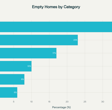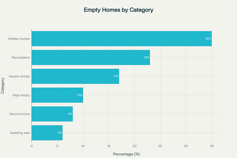 Holiday homes represent the largest category at 35% of all empty properties, followed by homes undergoing renovations and repairs (23%), and vacant rental properties (17%). Critically, approximately 10% of empty homes are intentionally kept vacant, representing potential housing stock that could be reintroduced to the market through appropriate interventions.[6][7][5]