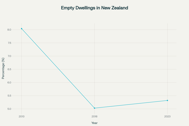 New Zealand faces a substantial challenge with 111,666 empty houses recorded in the 2023 Census, representing 5.32% of the country's total housing stock. This figure has increased from 97,842 empty homes in 2018, marking a significant rise in vacant properties despite the nation's ongoing housing crisis.[1][2]