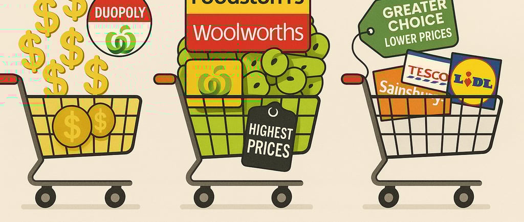 Australia maintains more consistent access, with both Woolworths and Coles operating extensive national networks. However, the duopoly structure limits genuine price competition across all regions.