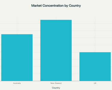 Market concentration comparison showing the combined market share of the top two supermarket players in Australia (65%), New Zealand (85%), and the UK (40%)