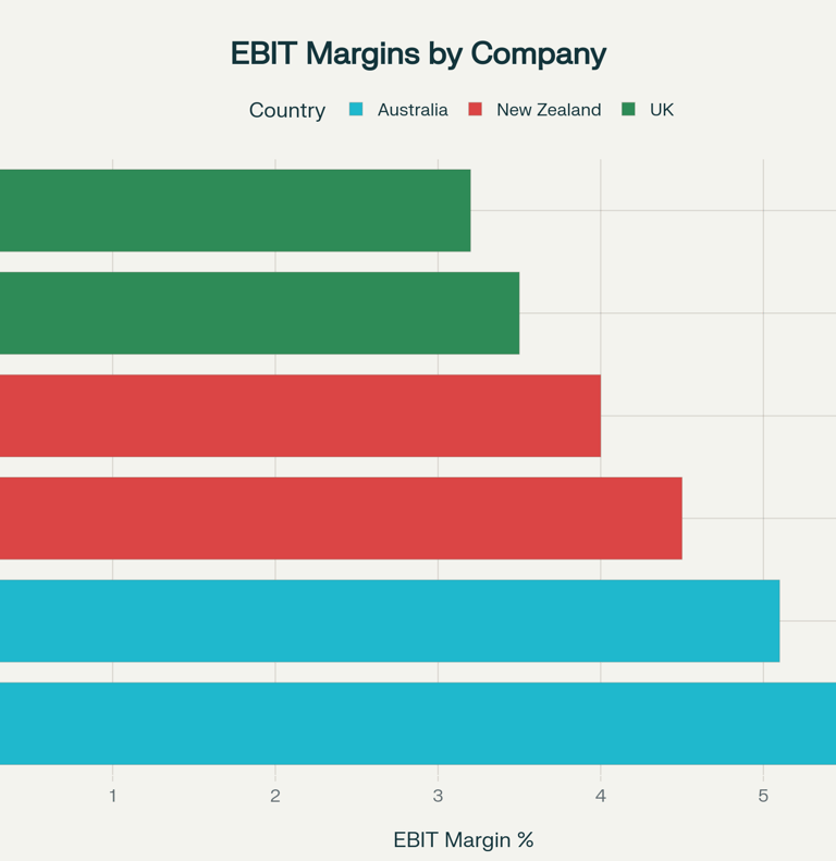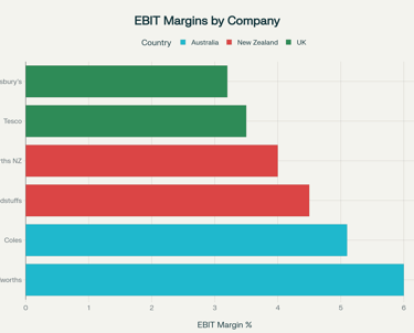 EBIT profit margins comparison across major supermarket chains in Australia, New Zealand, and the UK, showing Australian supermarkets achieving the highest profitability