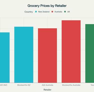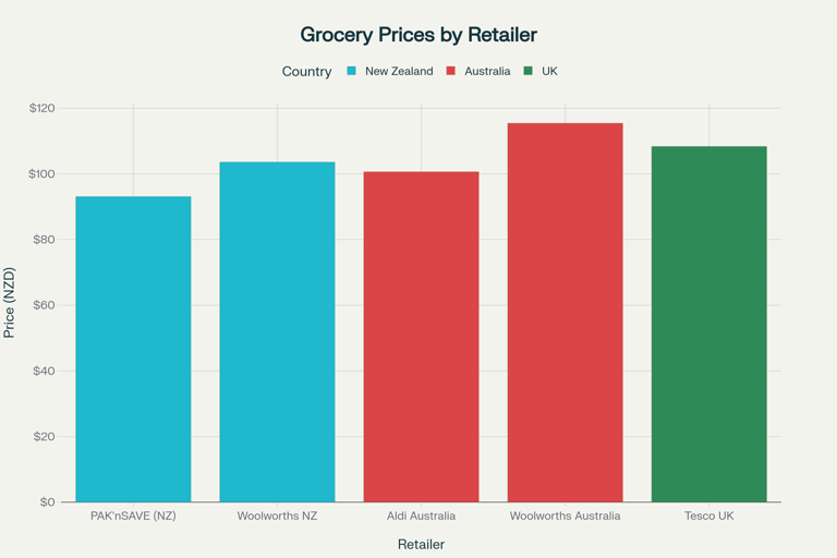 Key finding: New Zealand's PAK'nSAVE offers the lowest prices at NZD $93.09, while Australian Woolworths charges the highest at NZD $115.44. However, these comparisons must account for GST differences, as New Zealand applies 15% GST to all food items while Australia exempts basic groceries and the UK has no VAT on most food products.