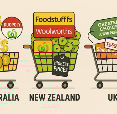 The investigation reveals stark differences in supermarket competition across the three countries, with New Zealand exhibiting the highest concentration and consumer harm, Australia facing an oligopoly with excessive profitability, and the UK maintaining the most competitive environment. New Zealand's virtual duopoly (85% market share) significantly exceeds Australia's concentrated duopoly (65%) and the UK's more competitive oligopoly (40% for top two players).